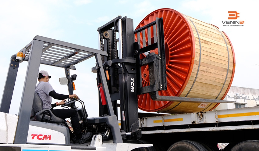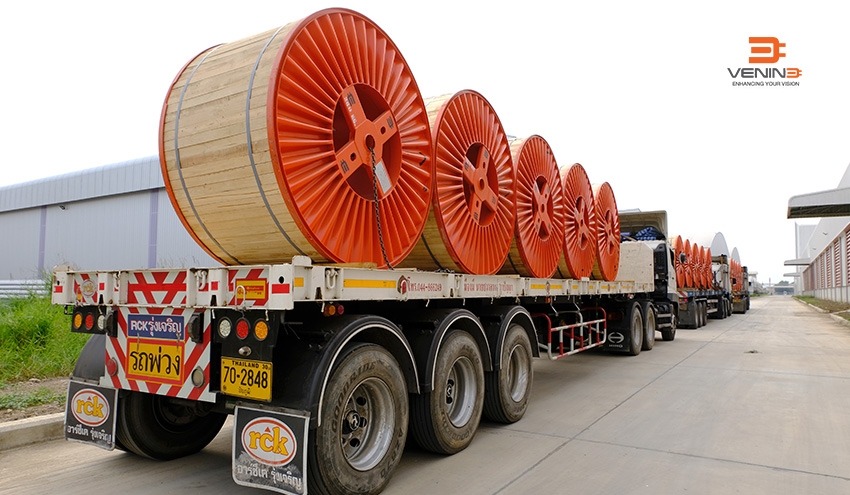 ภาพการจัดส่งสายส่งไฟฟ้าแรงสูง 1272 MCM ACSR 500 kV ที่ผลิตโดย บริษัท สายไฟฟ้าวีนายน์เคเบิ้ล จำกัด เพื่อส่งมอบให้แก่ การไฟฟ้าฝ่ายผลิตแห่งประเทศไทย (EGAT) นำไปใช้ในโครงการสร้างและติดตั้งโครงข่ายสายไฟฟ้าแรงสูงทั่วประเทศไทย